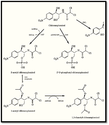 Figure 5. Enzymatic inactivation of chloramphenicol. CAT, chloramphenicol 3′-O-acetyltransferase; CPT, chloramphen CML, chloramphenicol hydrolase.
