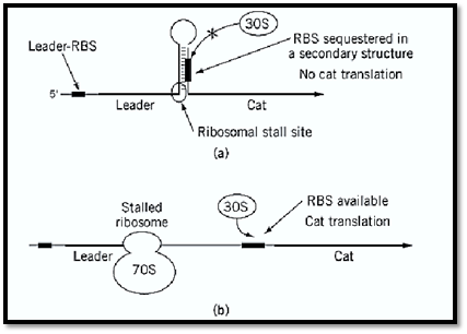 6.4. Induction of Chloramphenicol Resistance by Translational Attenuation Chloramphenicol resistance by enzymatic modification in both Gram-positive and Gram-negative bacteria can be either constitutive or inducible. What is unusual about inducible chloramphenicol resistance is that it occurs by translational attenuation, rather than by transcriptional attenuation. The ribosome-binding site for the resistance determinant is sequestered in a secondary “hairpin” structure situated within the encoding mRNA; a short, translated open reading frame, termed the leader, lies upstream of this structure. In the absence of the antibiotic, the secondary structure is maintained, the ribosome does not translate the mRNA that constitutes the hairpin, and the resistance gene is not translated. In the presence of the antibiotic, the ribosome stalls at the leader sequence and the secondary structure relaxes, allowing the cat (or cml) determinant to be translated (18) (Fig. 6).