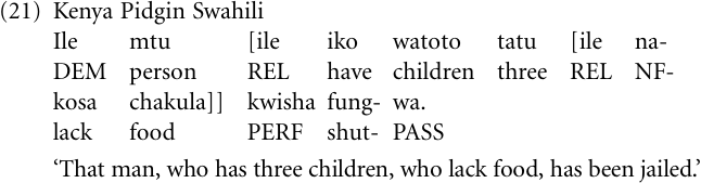 An example of nested recursion was provided from Kenya Pidgin Swahili in “The rise of new functional categories” (example (17e)). We described how this pidgin arose in the early twentieth century without any relative clause construction, and how it acquired such a construction by grammaticalizing the distal demonstrative ile ‘that’ to a relative clause marker—in much the same way as had happened earlier in the history of English. Now, whenever the newly acquired relative construction determines the subject noun phrase, it immediately follows the latter, with the effect that the subject is detached from the verb phrase. In this context, the predictable outcome of grammaticalization is therefore center-embedding and nested recursion. Note that nested recursion is productive, as example (21) shows, even if such double nestings are rarely found in normal discourse.