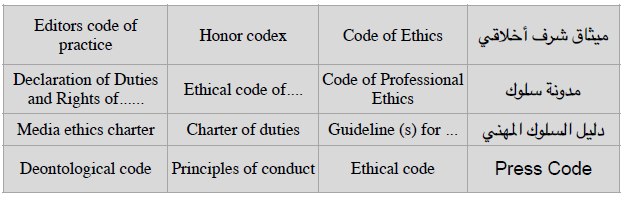 وهذه التسميات المختلفة تأتي تبعاً لقرار كل مؤسسة أو اتحاد أو نقابة، بما يتلاءم مع لغة البلد الأم ومع المعنى والمدلول المطلوب التعبير عنه في عمل نموذج أخلاقي لممارسة مهنة الصحافة.