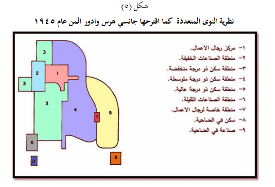 وضع اساس هذه النظرية ( مكنزي) عام 1945 الذي يدعي ان المدن الكبرى تتكون من عدد من النوى او المراكز الثانوية ، فضلا عن المركز الرئيسي او المنطقة التجارية المركزية ، ثم طورها كل من (جانسي هرس وادور المن) اللذان حددا اصناف من المناطق السكنية تتوزع في جميع مناطق المدينة وكل صنف منها يتبلور حول بؤر او مراكز معينة ، وتتمثل هذه المناطق بمنطقة الدور واطئة النوعية ، ومنطقة الدور متوسطة النوعية ، ومنطقة الـدور عالية النوعية ومنطقة الضواحي السكنية ويبدو ان نظرية النوى المتعدد تنطبق الى حد ما على مدينة القاهرة وحلوان في مصر. وقد افترض الباحثان جانسي هرس وادور المـن إلى ان اهـم العوامل التي تؤدي الى ظهور النوى في المدن هي: