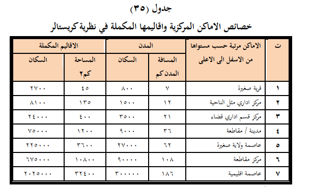 3ـ صنف كريستالر الاماكن المركزية او المدن المركزية على اساس حجمها ومركزتيها الى مراتب او مستويات لذلك صنفها الى ( 7 ) مستويات ، يمتاز كل صنف منها بعدد معين من السكان واقليم معين يتصف بمساحة محدودة وعدد معين من السكان ايضا ، فضلا عن تباعد بين مراكز كل صنف او مستوى.