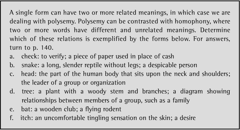 The sentences in (2–5) contain pairs of words with very different – even contradictory – interpretations. Yet they represent single lexemes. In (2a) window refers to a solid barrier, but in (2b) an aperture; glass (3a–b) can refer to the container or to the liquid inside. Examples like these show that the same phonetic string can convey different, but related meanings depending on the linguistic and pragmatic context. (As seen in Lexemes a given phonetic string may also convey unrelated meanings, in which case we are dealing with homophones.)