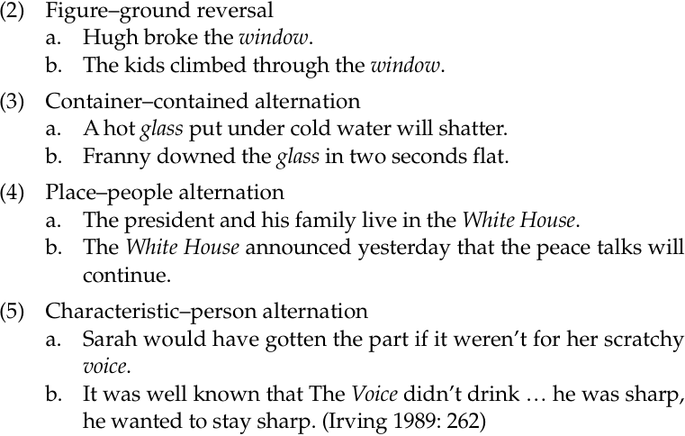 Besides the mass/count alternation, there are several other well-known alternations we find in noun meaning. A few are illustrated below: