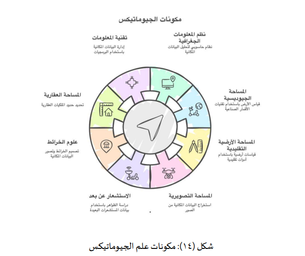 هذه هي المكونات الرئيسية للجيوماتيكس شكل (14) كما حددتها الأدبيات الأكاديمية. ويجدر الملاحظة أن هندسة الجيوماتكس تعد فرعًا قريبًا جدًا، وهي تركز بشكل أكبر على تطبيق المبادئ الهندسية في تصميم وتشغيل الأنظمة التي تجمع البيانات المكانية وتحللها. لكن بشكل عام، يمكن اعتبار هندسة الجيوماتكس مظلة تشمل تصميم الأجهزة والبرمجيات التي يستخدمها علماء الجيوماتيكس في المكونات المذكورة أعلاه.