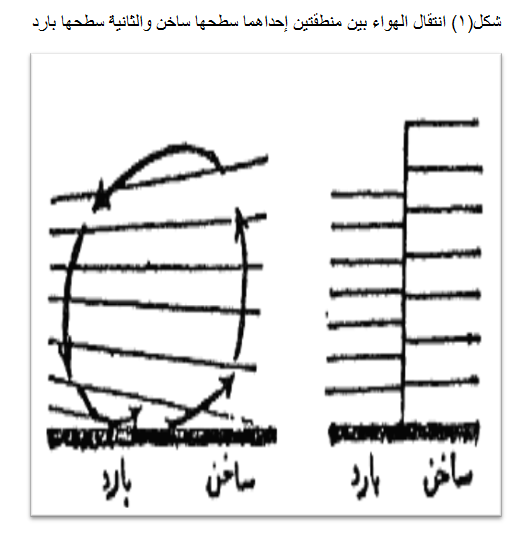 ان في اثناء تناقص الضغط الجوي بانتظام تقريبا في توزيعه الرأسي فإن توزيعه الأفقي يخضع لعدة عوامل تؤدي إلى تباينه من مكان إلى آخر وإلى تغيره من وقت إلى آخر، وإن هذا التباين المكاني وهذا التغير الزمني هما اللذان يتحكمان في حركة الرياح على سطح الكرة الأرضية، سواء على نطاق إقليمي واسع أو على نطاق محلي بين الأماكن المتجاورة، وسواء كانت هذه الحركة بشكل نسيم خفيف، أو بشكل عواصف مدمرة، ولهذا فإن التوزيع الأفقي للضغط الجوي هو الذي يدخل دائما في دارسة المناخ. وأهم العوامل التي تتحكم في التوزيع الأفقي للضغط الجوي هي درجة الحرارة ورطوبة الهواء والتقاء التيارات الهوائية من اتجاهات متقابلة. وتعتبر درجة الحرارة بالذات العامل الرئيسي الذي يتحكم في توزيع الضغط الجوي الذي يتناسب معها تناسبا عكسيا، فكلما ارتفعت درجة الحرارة تمدد الهواء وقلت كثافته وحدث به تصعيد إلى أعلى فيتكون نتيجة لذلك ضغط منخفض. وكلما انخفضت درجة الحرارة انكمش الهواء وزادت كثافته وهبط نحو سطح الأرض فيتكون نتيجة لذلك ضغط مرتفع، فإذا كانت منطقتا الضغط الجوي المنخفض والضغط المرتفع متجاورتين فإن الرياح تتحرك عند سطح الأرض من منطقة الضغط المرتفع التي هبط هواؤها إلى منطقة الضغط المنخفض التي حدث تصعيد في هوائها، بينما يحدث العكس في أعلى الجو، حيث تتحرك الرياح من المنطقة التي حدث تصعيد في هوائها إلى المنطقة الأخرى التي حدث هبوط في هوائها، وهكذا تتكون دورة هوائية خاصة بين المنطقتين "شكل (1)". أما رطوبة الهواء فإن تأثيرها لا يمكن أن يقارن بتأثير درجة الحرارة ومع ذلك فإن زيادتها تساعد على نقص الضغط الجوي لأن بخار الماء أخف من الهواء وأنه لهذا السبب يظل عالقا به.