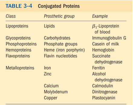 Many proteins, for example the enzymes ribonuclease A and chymotrypsinogen, contain only amino acid residues and no other chemical constituents; these are considered simple proteins. However, some proteins contain permanently associated chemical components in addition to amino acids; these are called conjugated proteins. The non–amino acid part of a conjugated protein is usually called its prosthetic group. Conjugated proteins are classified on the basis of the chemical nature of their prosthetic groups (Table 3–4); for example, lipoproteins contain lipids, glycoproteins contain sugar groups, and metalloproteins contain a specific metal. A number of proteins contain more than one pros thetic group. Usually, the prosthetic group plays an important role in the protein’s biological function.