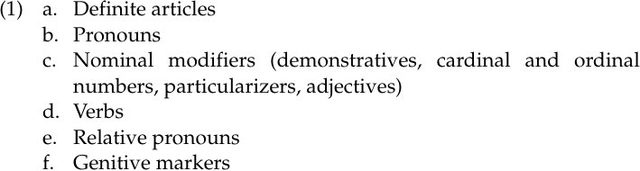 The set of words with which a noun enters into an agreement relation varies from language to language. In Kujamaat Jóola this set includes the categories in (1):