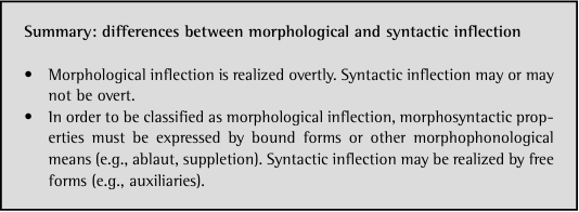 Another difference between the morphological and syntactic usage of the term inflection is that morphologists speak of inflection only when dealing with bound forms. The reason for this is clear when you consider that we defined inflection informally as “bending” of a lexeme.