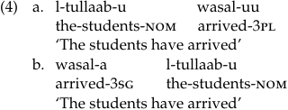 In Arabic, the basic generalization is that subject–verb number agreement appears on the verb when the word order is SV (subject–verb) (4a) but not when it is VS (4b) (data from Ouhalla 1994: 43):