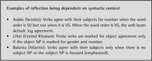 In sum, in Balanta and Arabic subject agreement and //Ani object agreement, the realization of agreement is either obligatorily present or obligatorily absent, depending on the syntactic context. If you have had extensive experience with syntax you might want to investigate in greater detail the structural analyses behind these facts.