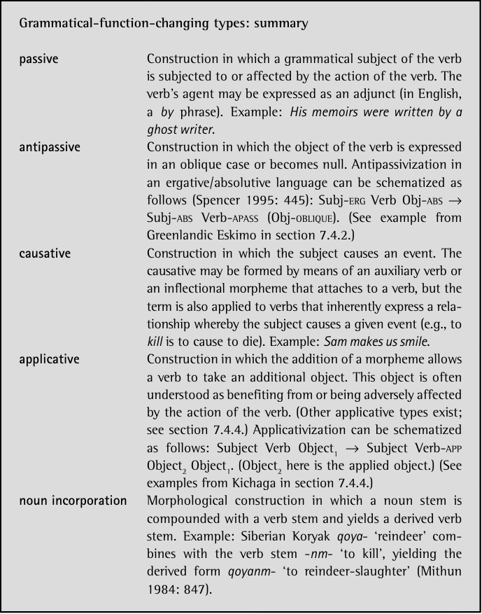 We have addressed a variety of different topics, including ways in which morphologists and syntacticians may approach inflection differently, structural constraints on the morphological realization of morphosyntactic features, and grammatical-function-changing morphology found cross- linguistically, including passive, antipassive, causative, applicative, and noun incorporation.