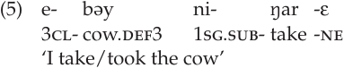 Kujamaat Jóola does not have a tense system that expresses time-related notions like ‘past’ and ‘present’ directly.1 Instead, it has an aspectual system. This means that it expresses notions such as duration, completeness, and doubt, which have more to do with the nature of the action of the verb or with the speaker’s attitude than with time. The unmarked form of the verb can be interpreted as either present or past, as seen in (5):