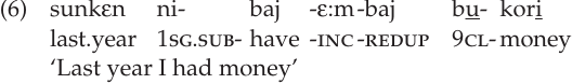 In (6), it is understood that the subject no longer has money. Thomas and Sapir (1967) present another example: Fuken nij••njaw kabaak, εmitey dεs ɔfɔm məniləñu ‘Yesterday I was going to Kabâk, but the rain overtook me (en route) and I returned (without getting there).’ Here the verb nijεεn jaw (jεεn < -jaw-ε:n ‘go’ + INC) ‘was going’ indicates that the action of going was not completed. Without the dubitive-incompletive marker, this sentence would mean instead that the subject went to Kabâk despite the rain.