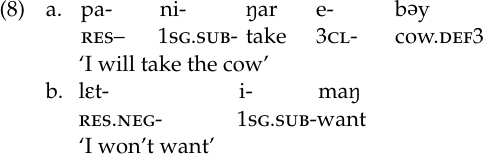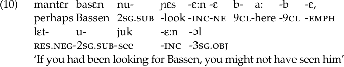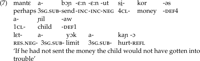 Lastly, combining the dubitive-incompletive suffix with the resultative prefix lεt-, a negative marker, results in a construction that indicates an action that missed taking place or that will not be accomplished. We might translate it as ‘might have’ or ‘might not have’.