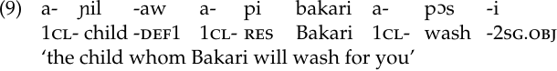 In relative clauses, the future is expressed by a resultative clitic pi that combines with the marker agreeing with the relativized subject or object (Sapir 1965: 92). We see this in (9):