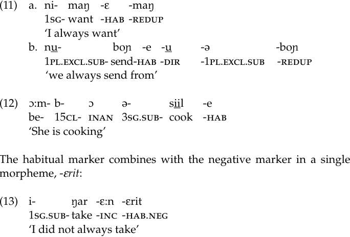 3 This is probably due to a phonological constraint against superlong vowels, which we would have if the habitual e were to merge with ε:n. Furthermore, if the illicit sequence */ε+ε:n/ were to be reduced to /ε:n/, the habitual meaning would be unrecoverable.
