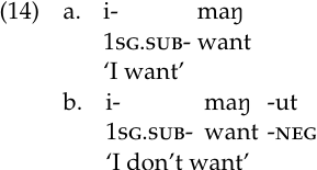 The negative is generally indicated by the suffix -ut (14b). As we saw, the resultative and negative are expressed by a single morpheme, lε- ̴ lεt - (cf. (8b)), and the habitual and negative are also expressed by a single morpheme, -εrit (cf. (13)). Similarly, -ulɔ ‘toward speaker’ and ɔrut ‘not yet’ combine to produce ɔrulɔ:t (not shown here).