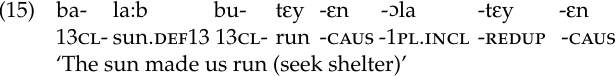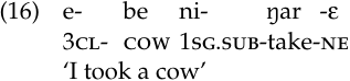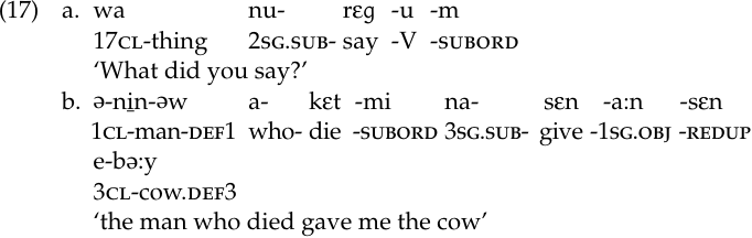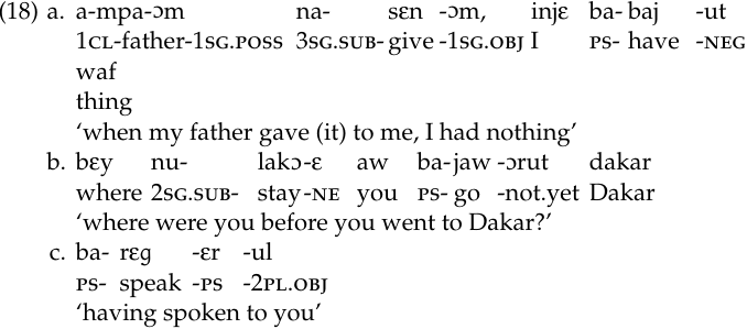 The past subordinate (ps), marked by the circumfix ba … εr, sets off a subordinate clause (18a–c). As its name indicates, the information within the subordinate clause typically refers to an event or state that precedes the action described by the main verb, although the opposite is true when the subordinated verb bears the suffix ɔrut ‘not yet’ (18b). In negative constructions, the second element of the circumfix, -εr, is dropped (18a–b). What might this suggest about the true nature of this circumfix?