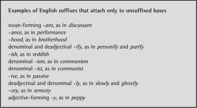 Productivity can also be limited by morphological constraints. For example, a morphological process may require the base to have a certain structure, to belong to a certain morphologically or syntactically defined class, such as a gender, or to end in a particular affix. We encountered a morphological constraint of the first type: certain English suffixes, such as -ish, attach only to unsuffixed bases. (The following box, based on Fabb 1988: 532–3, lists some of them.) As an illustration of the second type, we find affixes that attach only to bases that have a particular etymological origin. Bauer, citing Mackridge (1985: 320), gives the example of Modern Greek, where the suffix -adoros may only attach to words of Romance origin. Thus, we find kombinadoros ‘trickster’ from kombina ‘trick’ (< French combine ‘trick’).