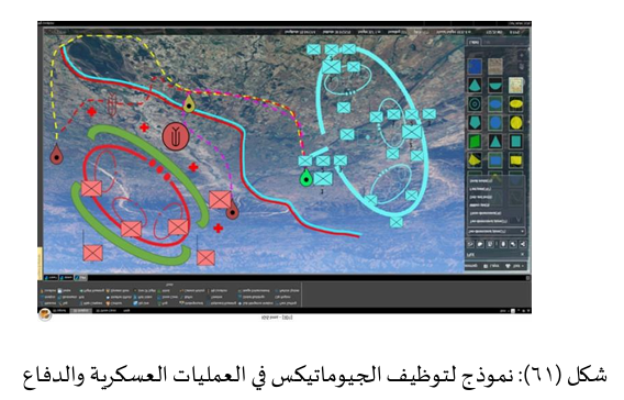 تحتفظ الوكالات العسكرية ببيانات جغرافية مكانية مفصلة للغاية خرائط ، صور أقمار صناعية للتخطيط الاستراتيجي والعمليات يساعد تحليل التضاريس على معرفة خط الرؤية للرادارات، أو تحليل قابلية التنقل عبر البلاد تستخدم القوات الحديثة GPS بكثافة لتحديد مواقع القوات والأصول لدى العديد من الدول وكالات رسم خرائط عسكرية تنتج خرائط مصنفة وغير مصنفة وغالباً ما يجد خريجو الجيوماتكس وظائف هنا مثل مركز الدفاع الجغرافي في المملكة المتحدة أو الوكالة الوطنية للاستخبارات الجغرافية المكانية في الولايات المتحدة.