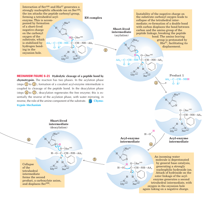 As the Ser195 oxygen attacks the carbonyl group of the substrate, a very short-lived tetrahedral intermedi ate is formed in which the carbonyl oxygen acquires a negative charge (Fig 6-21). This charge, forming within a pocket on the enzyme called the oxyanion hole, is stabilized by hydrogen bonds contributed by the amide groups of two peptide bonds in the chymotrypsin back bone. One of these hydrogen bonds (contributed by Gly193) is present only in this intermediate and in the transition states for its formation and breakdown; it re duces the energy required to reach these states. This is an example of the use of binding energy in catalysis.