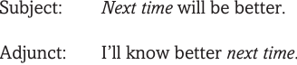 An important property of language is the fact that there is no one-to-one correspondence between the class of unit and its function. While it is true that certain classes of unit typically realize certain functions, Nominal Groups at Subject and Object functions, for instance, it is nevertheless also true that many classes of unit can fulfil many different functions, and different functions are realized by many different classes of unit. For instance, the NG next time can fulfil the following clause functions, among others: