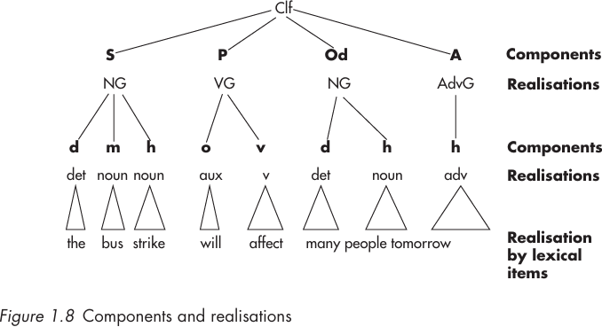Each of these is in turn realized by a unit which is itself, at least potentially, a configuration of elements, and these in turn are realized by others until the final stage is reached and abstract categories such as subject, head, modifier, etc., are finally realized by the segments of the spoken or written language. The ‘structural tree’ on page 19 diagrams this model of analysis at the three unit ranks of clause, group and word, to illustrate the clause The bus strike will affect many people tomorrow.
