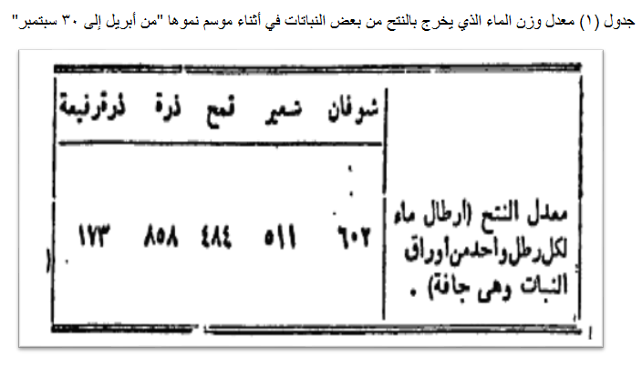 2- تجفيف النبات أو جزء منه، وإيجاد الفرق بين وزنه وهو حي ووزنه بعد أن يجف، ويمكن أن يتخذ هذا الفرق أساسا لتقدير النتح من هذا النبات، وقد أجريت تجارب من هذا النوع على بعض النباتات في كلورادو بأمريكا الشمالية، فظهر أن وزن ما يخرج منها بالنتح طول موسم نموها يكون كما هو مبين في الجدول التالي (2).