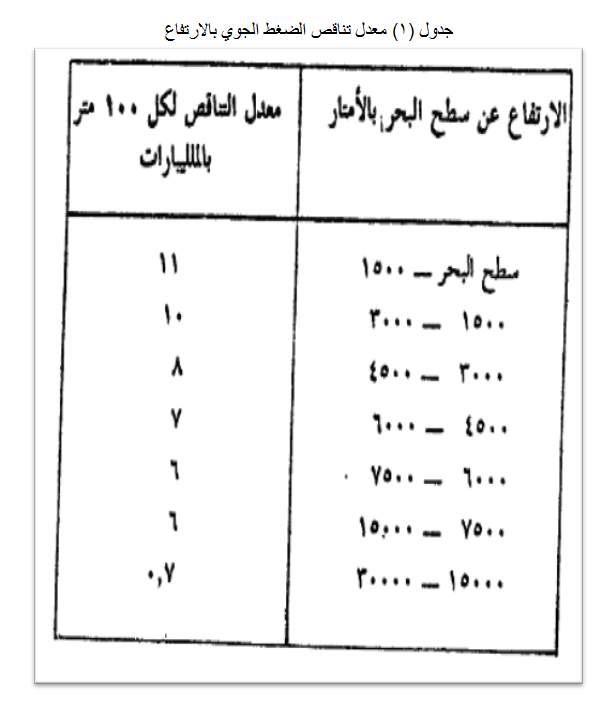 ومن الطبيعي أن يكون هناك تناسب عكسي بين الضغط الجوي والارتفاع عن سطح البحر، وذلك بسبب تناقص سمك الغلاف الجوي وتناقص نسبة الغازات الثقيلة التي تدخل في تركيبه. وعلى الرغم من أن سرعة تناقص الضغط الجوي بالارتفاع ليست واحدة في كل قطاعات الجو، وبأنه يتأثر بصفاء الجو وبوجود بخار الماء والغبار في المستويات المنخفضة، فإن هناك معدلات عامة وتقريبية لهذا التناقص في المستويات المختلفة كما بينها الجدول"6" ومنه يتبين أن التناقص يكون سريعا نسبيا في المستويات المنخفضة ثم يتناقص معدله كلما زاد الارتفاع، فبينما يتناقص بمعدل 11 ملليبار في كل مائه متر في المستويات الواقعة بين سطح البحر وارتفاع 1500 متر، فإنه يتناقص بمعدل 6 ملليبارات في المستويات الواقعة بين 6000و 7500 متر بمعدل 0.7 في المستويات الواقعة بين 15 ألف و30 ألف متر.