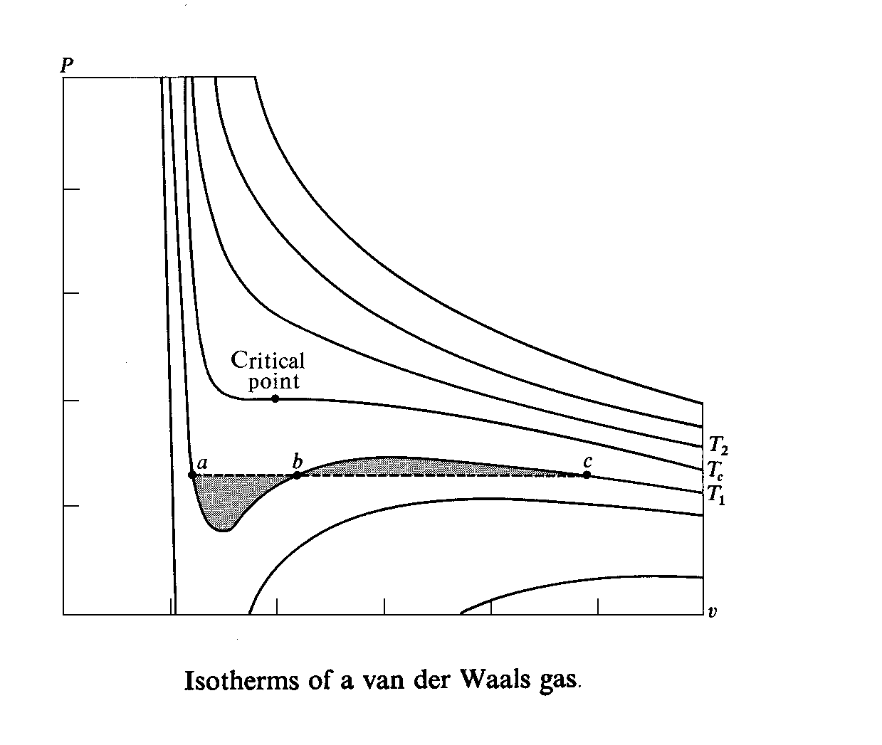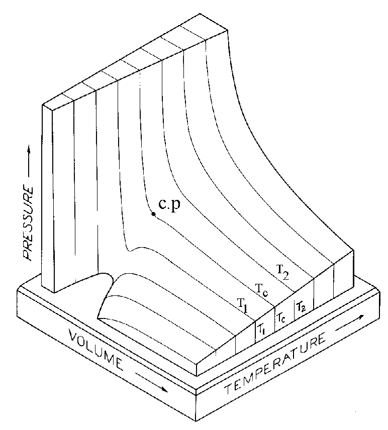 يُبَيِّن الشكل 1 سطح P-v-T لغاز فان درْ فالس والشكل 2 مسقط هذا السطح على المستوى P-v لعدد من الأيزوحراريَّات. نستطيع كتابة معادلة فان درْ فالس بدلالة v و قواها (أي v، v2 و v3 ) كما يلي:
