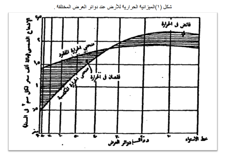ولكن تقدير الإشعاع الشمسي الواصل إلى الأرض في العروض المختلفة لا يكفي وحده لتقدير صافي الإشعاع المكتسب في هذه العروض بل يجب أن يخصم منه الإشعاع المرتد إلى الفضاء، حيث إن الفرق بينهما هو الذي يحدد الوافر أو العجز في الميزانية الحرارية للأرض كما يتضح من شكل"1" (1). ومنه يتبين أن هناك وفرا حراريا في العروض المدارية ويقابله عجز في العروض العليا، وأن هناك تعادلا بينهما حوالي دائرة عرض 30.