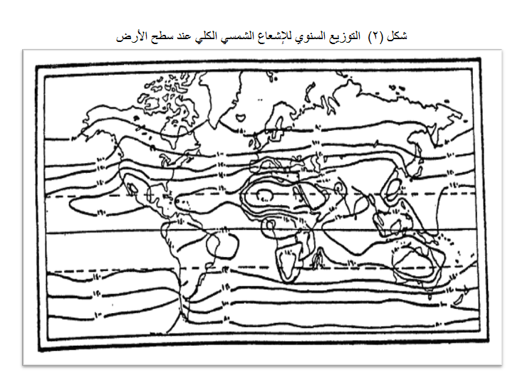 وتبين الخريطة التوزيع السنوي للإشعاع الشمسي الكلي عند سطح الأرض(2) .ومن هذه الخريطة يتبين أن التوزيع الفصلي للإشعاع الشمسي الواصل إلى سطح الأرض يتمشى تماما مع دوائر العرض حيث تتدخل في توزيعه عوامل أخرى أهمها صفاء الجو وكمية ما به من سحب ومواد عالقة، فحوالي دائرة عرض 20 يسود الجفاف وتقل السحب بصفة عامة بسبب وجود الضغط المرتفع وراء المدار ولذلك فإن قمة الإشعاع الشمسي الواصل إلى الأرض تظهر على طول هذه الدائرة، بينما تؤدي كثرة السحب في مناطق أخرى إلى خفض هذا الإشعاع.