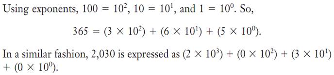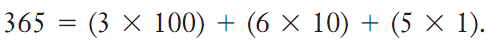 For example, there are 365 days in a year. In the base-10 number system, the value of each of the three digits 3, 6, and 5 depends on their po-