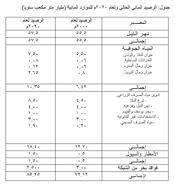 والجدول التالى يبين الرصيد المائى الحالى والمتوقع لعام 2020 :والذى يتضح منه إن كمية المياه المستغلة فعلا ( مصادر تقليدية) تبلغ ( 5.55 مليار م3 / سنوى) من مياه النيل ، (6.42مليار م3 / سنة) من المياه الجوفية ،(0.5 مليار م3/سنة) من الأمطار والسيول وهى مصادر مائية غير متجددة .. أما الكمية المستغلة من إعادة تدوير مياه الصرف الزراعى والصحى (مصادر غير تقليدية ) تبلغ 12.7مليارم3/سنة. وبذلك يبلغ إجمالى كمية الموارد المائية الحالية (72.12 مليارم3/ سنة) باعتبار ما يقرب من (3.00مليار م3/ سنة) فواقد شبكة الرى ويتوقع أن تصل إلى 85.25 مليارم3 /سنة بحلول عام 2020.