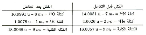 ولكي نعرف المزيد عن هذا التفاعل، يمكننا الرجوع إلى الجدول رقم (1)، لكي نحسب كتل النوى المتفاعل قبل وبعد التفاعل.