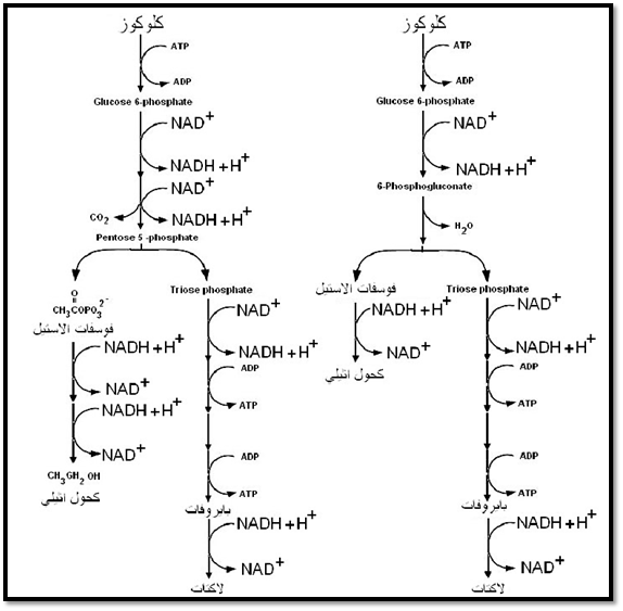 وفي التخمرات اللاكتيكية المتباينة وبعض التخمرات الاخرى يكون الانزيم الفعال فيها Phosphoketolase والمركبات الناتجة من جراء التغيرات على الكاربوهيدرات (وهي في هذه الحالة Xylulose – 5- p) تنشطر لتعطي فوسفات الاستيل وسكر ثلاثي الكاربون مفسفر. وفوسفات الاستيل تقوم بأكسدة NADH الى NAD+ ويتحول مركب فوسفات الاستيل بالاختزال الى الكحول الاثيلي ومجمل التفاعلات كما موضح في الشكل الآتي (شكل 6) اعلاه. وهذا المسار يعطي كمية اقل من الطاقة مقارنة بالمسار EMP.