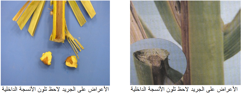 يصيب الفطر النخيل في مختلف أعماره ويصيب أيضاً الفسائل وتختلف الأصناف في قابليتها للإصابة والصنف سكري قابل للإصابة بالمرض، وتظهر الأعراض على أشجار النخيل عمر 10 سنوات اصفرار وذبول للسعف الخارجي ويتدرج الاصفرار من السعف الخارجي إلى الداخلي ثم يتلون السعف بلون رمادي مصفر حتى تموت الأشجار. وقد يظهر جفاف على السعف من جانب واحد بينما يظل وريقات الجانب الأخر خضراء اللون (البيوض الكاذب)، وعند عمل قطاع في منطقة التاج يظهر تلون للأنسجة الوعائية والأنسجة البرانشمية بلون بني داكن، وتحت ظروف الرطوبة المرتفعة تتكشف هيفات الفطر البيضاء اللون المزرقة مع جراثيم كونيدية صغيرة للفطر المسبب. وعند عمل قطاع في السعف المصاب يظهر تلون بني للأنسجة الداخلية وقد تتكشف أعراض التلون البني للأنسجة الداخلية لقاعدة النورات الزهرية.
