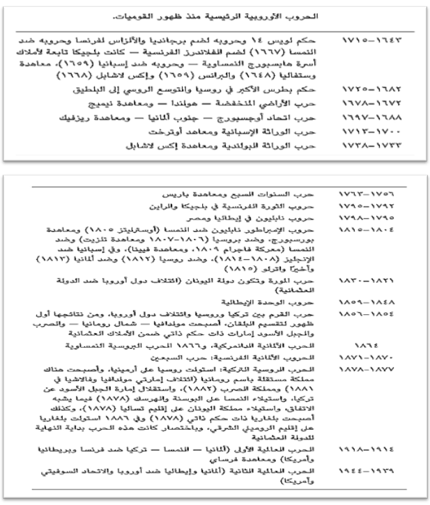 ويبدو أن القومية بمعناها الراهن قد نشأت في أوروبا خلال تبلور العصر الصناعي ومقدماته، وارتبطت ارتباطا وثيقا بالنمو الاستعماري وظهور أفكار وكتابات عن (المجد) القومي، والتوسع والسيادة لتحقيق (مهمة حضارية) في العالم، وقد أدى التطور الصناعي والقومي بأوروبا إلى اشتباكات دامية، ويكاد تاريخ أحداث أوروبا الحديثة أن يكون سلسلة من الحروب والدمار والتوسع وتعديلات الحدود، بحيث إن كل دولة تحاربت في وقت ما مع كل دولة أخرى، وتحالفت في وقت آخر مع كل دولة أخرى، تحاربت النمسا وبروسيا، وتحاربت فرنسا وإنجلترا أكثر من مرة، وتحاربت النمسا وبروسيا وروسيا على بولندا، وتحاربت الدانمرك والسويد، وتحارب السويسريون مع النمساويين، وحارب نابوليون كل أوروبا، وحاربت ألمانيا كل أوروبا مرتين، وفي المرتين يكاد أن يكون كل العالم قد جر إلى الحرب، وفي كل مرة تنتهي الحرب بغالب ومغلوب ومعاهدات واتفاقيات وحدود جديدة أو عود إلى حدود قديمة وتغير جذري لحياة السكان في مناطق الحدود، وتغيير للأوطان والجنسيات والتوجيه الاقتصادي والثقافي واللغوي والحضاري، ويكفي التدليل على ذلك ببعض التواريخ المهمة منذ منتصف القرن السابع عشر: