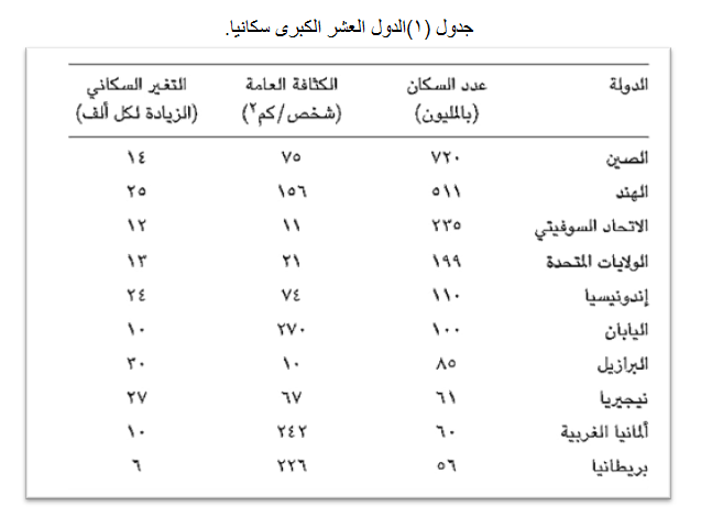 يوضح هذا الجدول أن الدول العشر الكبرى في أعداد السكان في الوقت الحاضر تختلف كثيرا في كثافة السكان، وبعبارة أخرى؛ إن إمكانيات الزيادة المستقبلية في الدول المزدحمة الهند واليابان وألمانيا الغربية وبريطانيا أقل بكثير من تلك التي نجدها في دول أخرى وخاصة البرازيل والاتحاد السوفيتي والولايات المتحدة، ومن ثم فإن مشكلة الضغط السكاني على الموارد تظهر حادة في الدول كثيفة السكان، وهذا مما يسبب ضرورة اعتمادها على التجارة والعلاقات الحرة بين الدول باستثناء الهند التي يمكن أن تتجه إلى أنشطة اقتصادية كثيفة العمالة كالصناعة والخدمات.