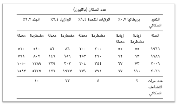 ١- تمثل بريطانيا والولايات المتحدة نمط الدول التي يظهر فيها التغير السكاني بمعدل أقل من المتوسط العالمي، بينما تمثل البرازيل والهند النمط الآخر المعاكس.