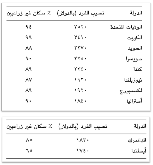 ويتضح من هذا الجدول أن الدول الكبرى باستثناء الولايات المتحدة لا تظهر بين الدول العشر الأولى في العالم في ترتيب أنصبة الفرد من الإنتاج القومي العام، وربما كان ذلك من أسباب عدم موضوعية هذا العنصر في التقييم السياسي لعلاقة الدولة والسكان، ومع ذلك فإنه مؤشر واضح من مؤشرات الرخاء الاقتصادي إذا ربطناه بعامل آخر مثل نسبة السكان الذين لا يعملون في قطاع الزراعة، ففي اليابان ٧٣ ٪ غير زراعيين وفي الاتحاد السوفيتي ٧٠ ٪ أيضا غير زراعيين، وفي كلتيهما نجد نصيب الفرد من الإنتاج القومي العام هو ٨٦٠ و ٨٩٠ دولارا على التوالي. وتظهر هذه الارتباطات بشدة في الدول النامية كما يتضح من الأرقام التالية :