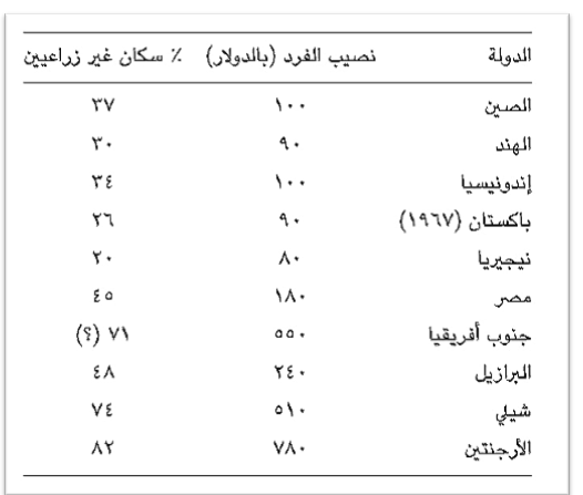 نصيب الفرد من الإنتاج القومي العام (بالدولار) ( ١٩٦٧ ) والنسبة المئوية للسكان غير الزراعيين (أرقام ١٩٦).