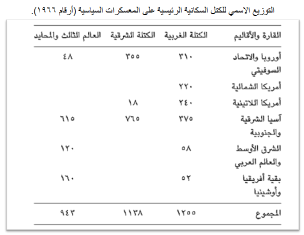 (7) أدت الأوضاع السكانية إلى صورة من عدم التكافؤ في التوزيع الجغرافي لم يكن لها مثيل من قبل، فقد أصبح ٥٥ ٪ من سكان العالم مركزين في آسيا الشرقية والجنوبية، وحوالي ٢٥ ٪ في أوروبا والاتحاد السوفيتي والشرق الأوسط والباقي موزعين على أجزاء العالم الأخرى بتركيز واضح في مناطق محددة وخاصة الولايات المتحدة، وتتوزع هذه الكتل الرئيسية في السكان على المعسكرات السياسية السائدة على النحو التالي: