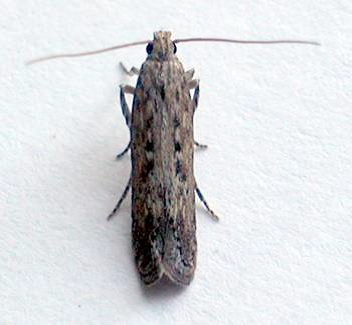 الحشرة البالغة فراشة صغيرة المسافة بين جناحيها المنبسطين 15.2 ملم لونها بني مائل للرمادي توجد بقع سوداء على الجناح الامامي الأجنحة الخلفية افتح لونا من الأجنحة الامامية ويمتد على الحافة الخلفية للجناح الخلفي صف كثيف من الشعيرات الرفيعة الطويلة.