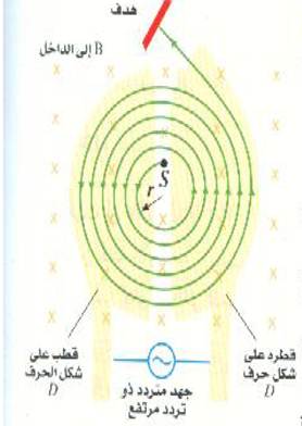 ويوضح الشكل ((1 العناصر الأساسية للسيكلوترون ، وكما هو الحال في مطياف الكتلة فإن هناك مجالاً مغناطيسياً متعامداً مع المنطقة التي تتحرك فيها الجسيمات المشحونة. وتتحرك الجسيمات في مسارات دائرية في غرفة مفرغة داخل قطبين على شكل D (لذا يسميان باسمه) وتفصلهما فجوة صغيرة. وفي تجربة نموذجية ، تنطلق البروتونات من المصدر s بالقرب من مركز الفجوة الواقعة بين القطبين. ومثلما يحدث في مطياف الكتلة ، فإن فرقاً للجهد بين القطبين يقوم بتعجيل البروتونات نحو أحد القطبين. وبمجرد دخول البروتون إلى داخل القطب "دي" فإنه "يبحر" في دائرة ويخرج من القطب في نفس اللحظة تماماً التي ينعكس فيها الجهد فيتعرض البروتون للتعجيل ( التسارع) من جديد ، فيدخل إلى القطب (الدى) المقابل بسرعة أكبر. ويدور في دائرة أكبر. وبتكرر هذا المشهد مرات ومرات وفي كل مرة يعجل البروتون إلى سرعات أكبر فأكبر وفي النهاية تحرف البروتونات عند محيط السيلكوترون على هيئة حزمة ذات طاقة عالية مسددة نحو هدف محدد.