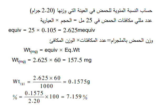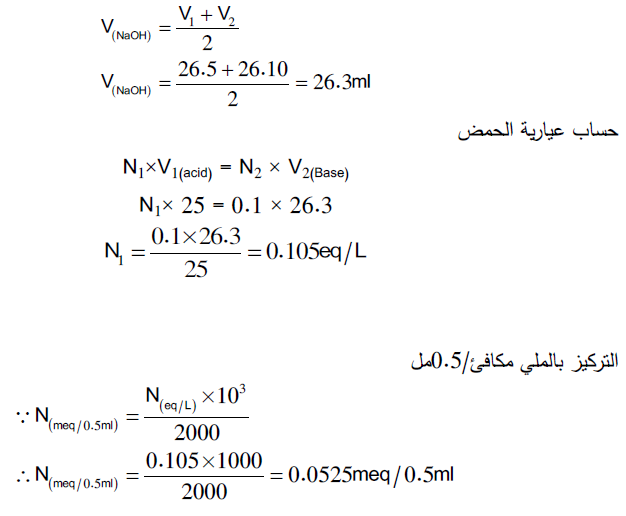 الحسابات: یتم حساب متوسط الحجم المستهلك من السحاحة (حجم هیدوركسید الصودویوم)