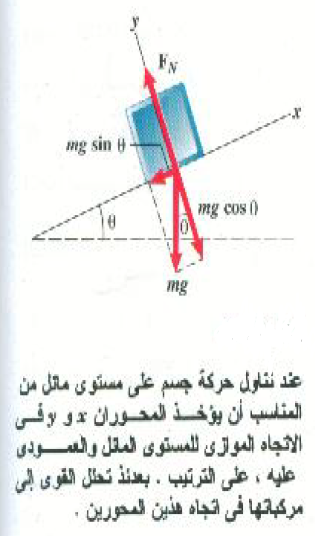 لاحظ في الشكل أن الوزن mg قد تم تحليله إلى المركبة x وتساويmg sin θ على استقامة المنحدر إلى أسفل ( في الاتجاه –x) والمركبة y وتساوي mg cos θ في الاتجاه -y. هل ترى لماذا كانت الزاوية θ في الوضع المبين في هذا الشكل ؟ أما القوة FN فتكون كلياً في الاتجاه +y. وإذا وجد احتكاك فإنه يتحتم أن يكون في الاتجاه x ، موجباً أو سالباً بحيث يكون دائماً في عكس اتجاه حركة الجسم( أو ميل الجسم للحركة في حالة السكون).