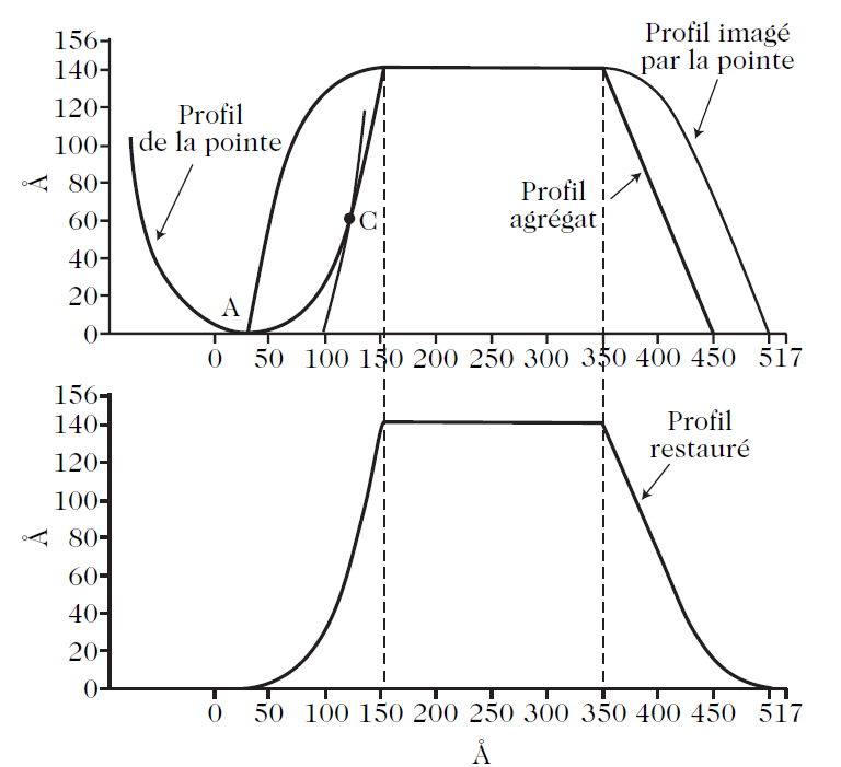 On the corrected profile, the mid-height size of the particles is now correct, but information has been lost at the base of the particle, up to a height equal to the radius of curvature of the tip.