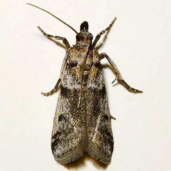 بالغات هذه العثة ذو لون رمادي ذو علامات مستعرضة اكثر قليلا طولها من 0.5 أنج وهي تشابه عثة دقيق البحر المتوسط Mediterranean flour moth البالغات لا تتغذى، ولها مدى واسع من العوائل التي تصيبها حيث تتغذى على قرون البقوليات Legume pods خاصة في مراحله الأخيرة من النضج او بعد التحلل كذلك الفواكه والجوز.